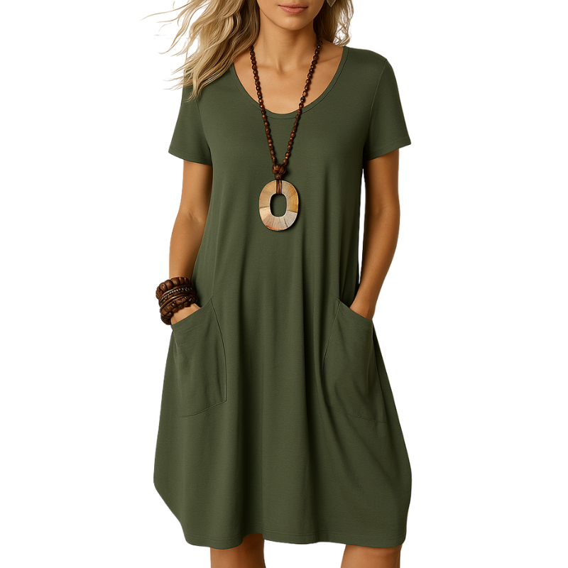 Einfach, stilvoll und unglaublich bequem – das Almara-Kleid kombiniert eine schmeichelhafte Passform mit praktischem Design. Hergestellt aus einem weichen, atmungsaktiven Material, das sich leicht auf der Haut anfühlt. Perfekt sowohl für den Alltag als auch für entspannte Anlässe.