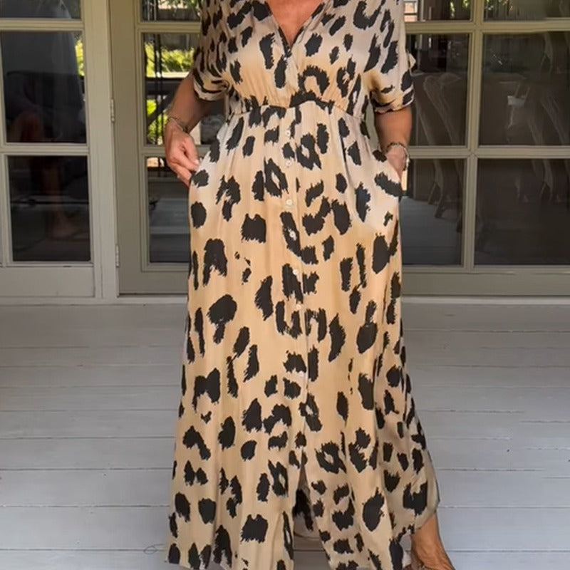 Celine™ vereint das Beste aus Komfort und Charakter. Dieses luftige Kleid mit Leopardenmuster verleiht dir einen selbstbewussten Look, während es leicht und lässig zu tragen ist – perfekt für späte Sommertage, Strandbesuche oder spontane Abende in der Stadt.