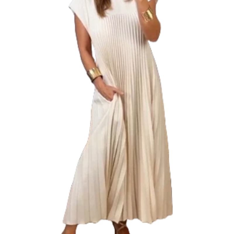 Hinterlassen Sie einen zeitlosen Eindruck mit Isabella – einem elegant fallenden Maxikleid mit raffinierten Plisseefalten, das einen exklusiven Touch verleiht. Der minimalistische Ausschnitt und die breiten Schulterdetails machen das Kleid sowohl modern als auch schmeichelhaft.