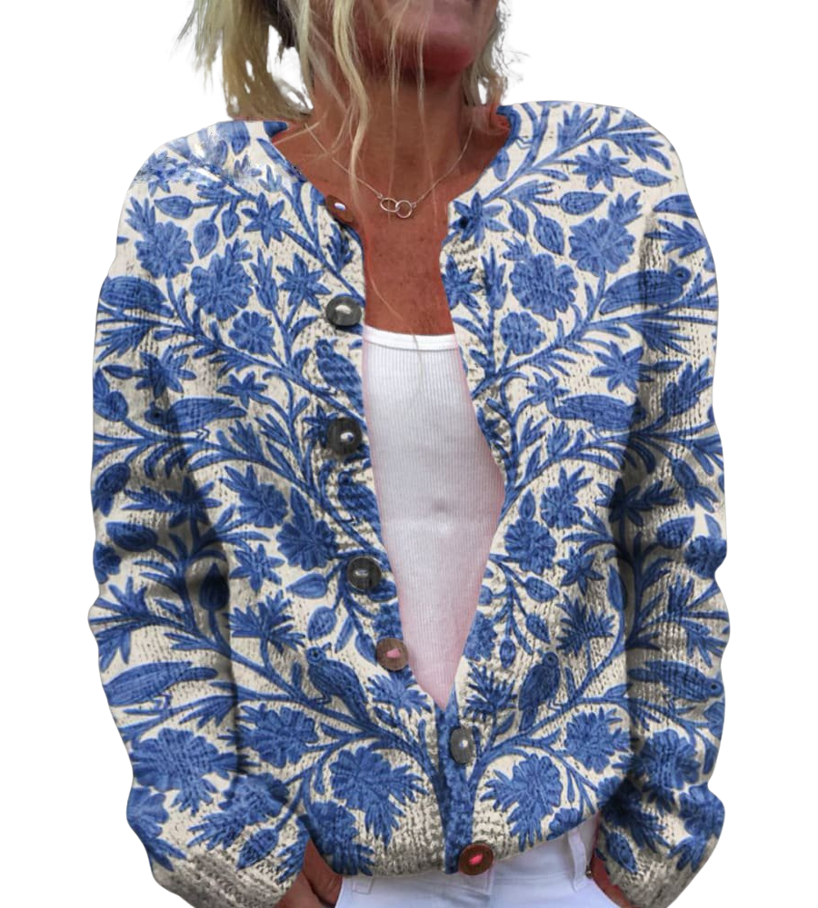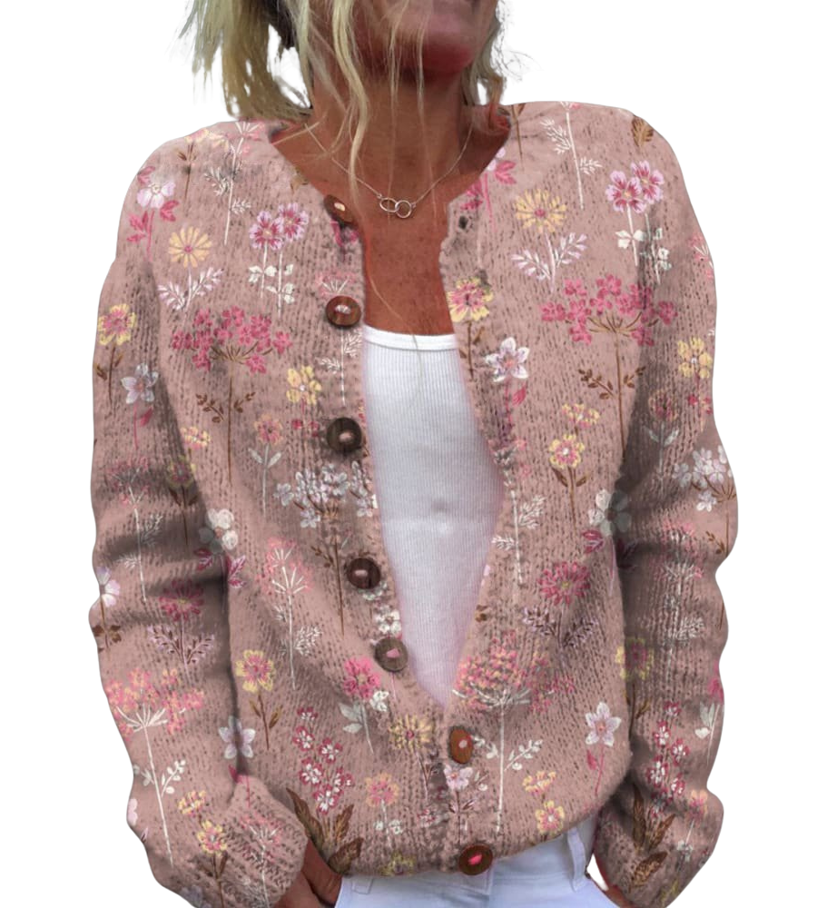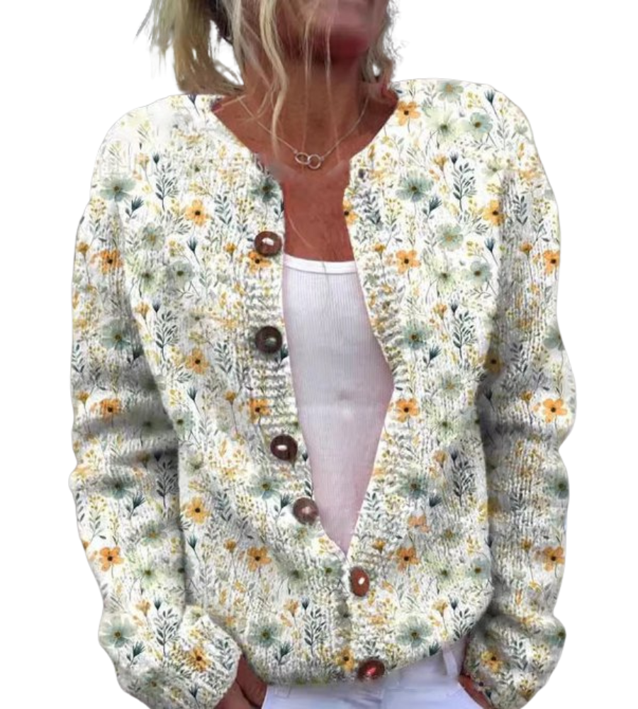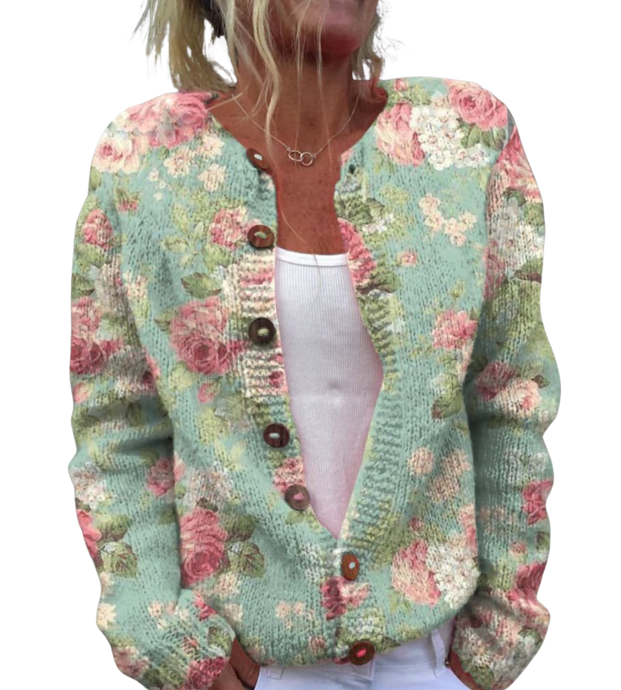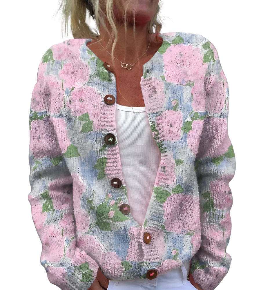 Geben Sie Ihrer Garderobe mit Ella einen frischen Wind – die Strickjacke, die Komfort mit einem femininen und einzigartigen Ausdruck kombiniert. Das schöne Blumenmuster verleiht einen künstlerischen Touch, während die dekorativen Knöpfe eine klassische Eleganz hinzufügen.