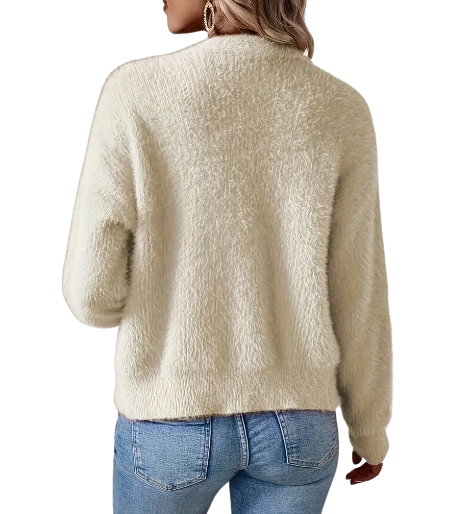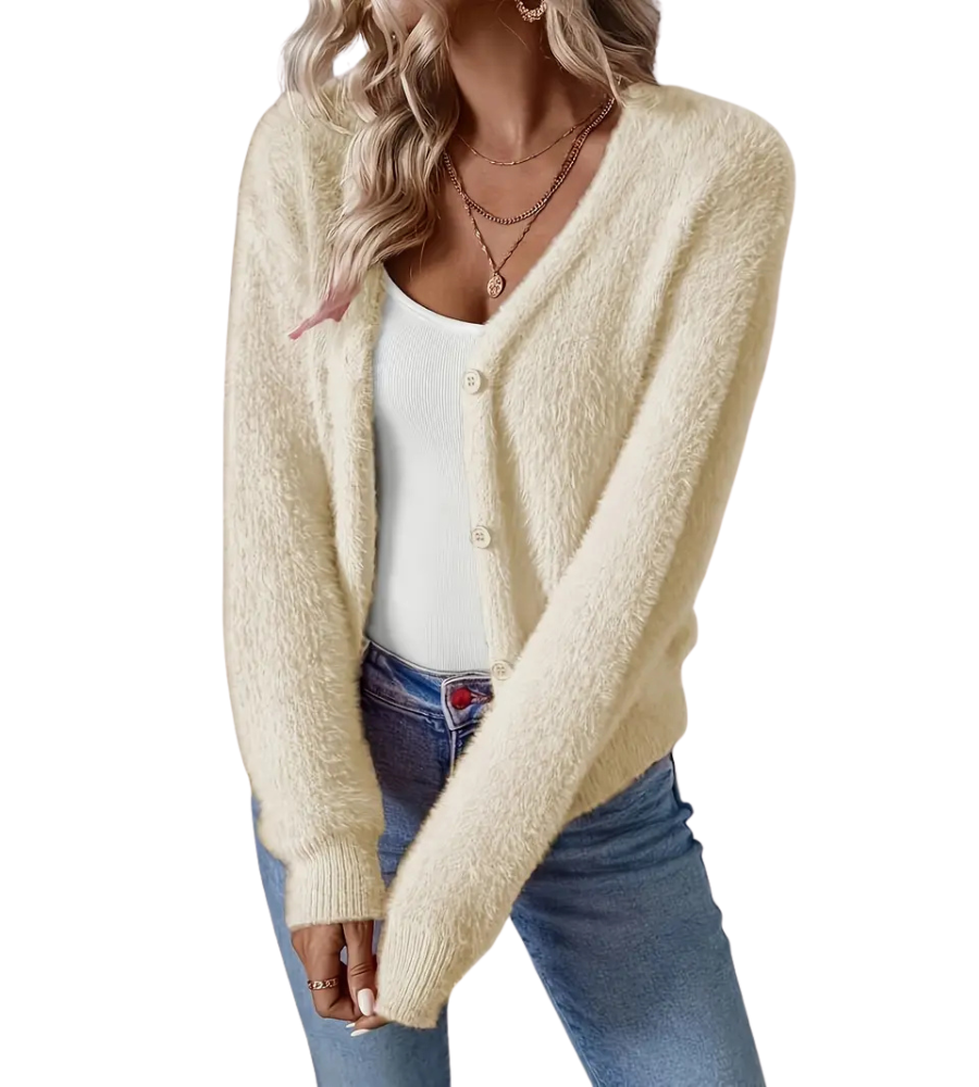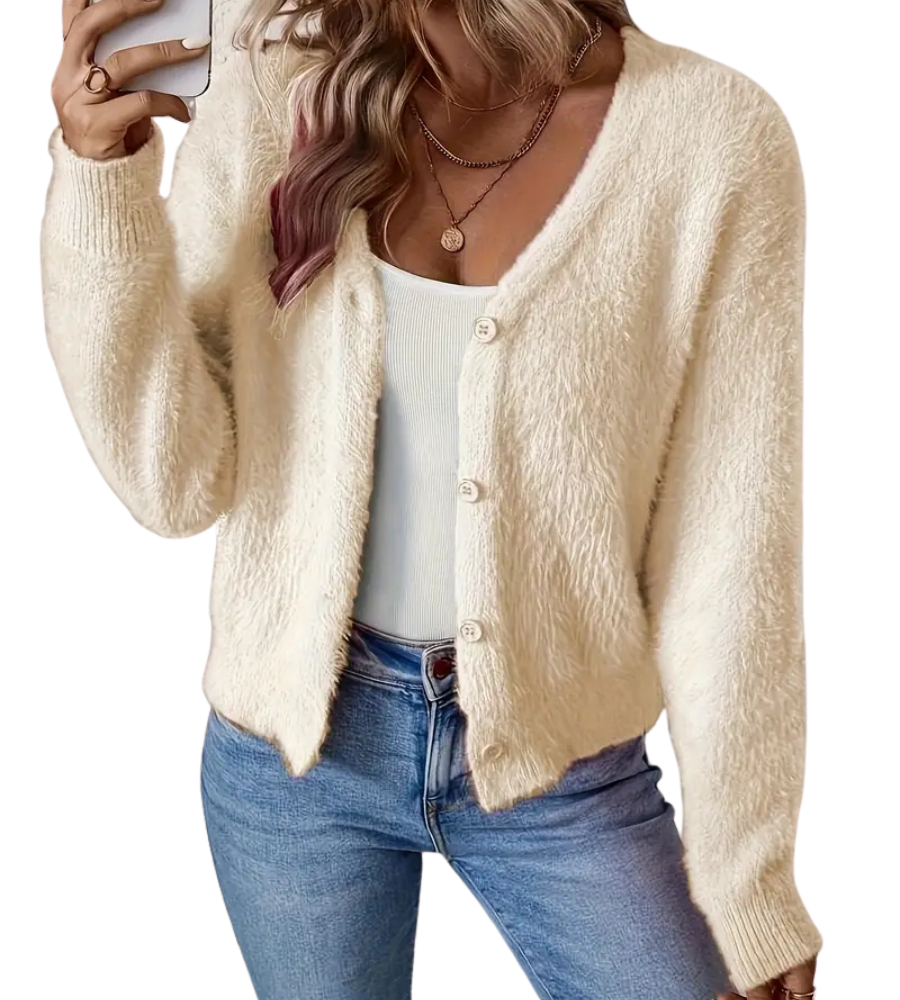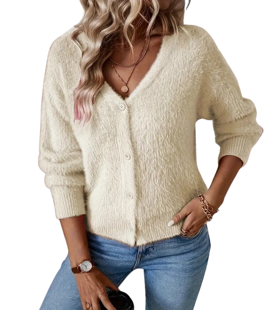 Mit klassischem V-Ausschnitt, kleinen Knöpfen und einer femininen Textur ist dies der Cardigan, den du immer tragen kannst – egal, ob du zu Hause entspannst oder dich für einen gemütlichen Abend mit Freunden kleidest.