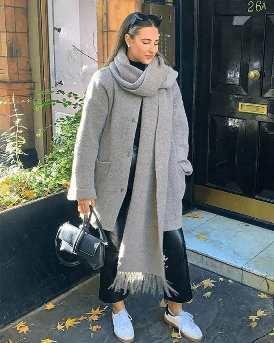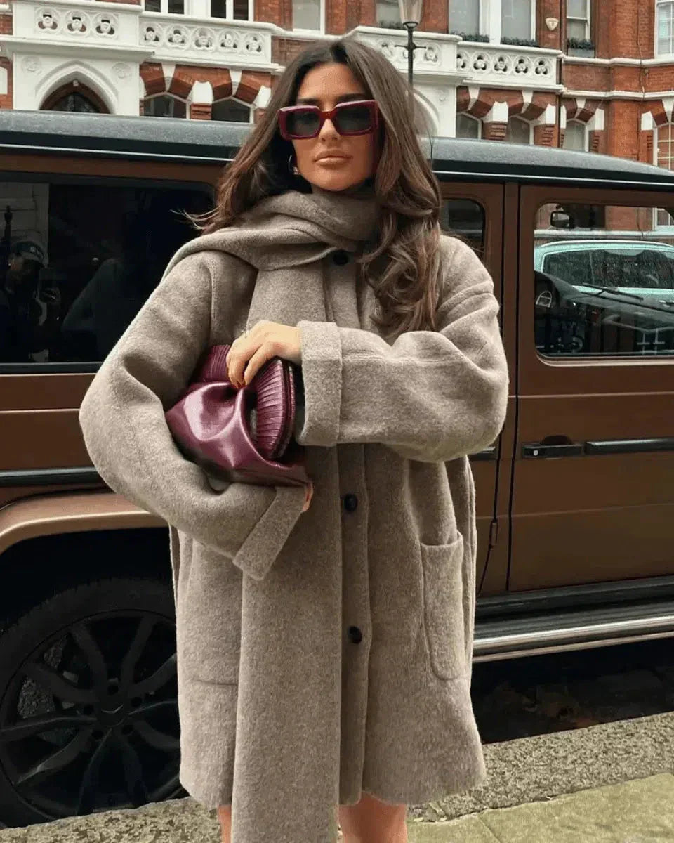 Der Diana Schal-Mantel kombiniert stilvolle Raffinesse mit höchstem Tragekomfort. Sein weicher, wärmender Wollmix und der integrierte Schal sorgen für eine edle Optik und halten dich auch an kühleren Tagen angenehm warm. Ob für einen Stadtbummel, das Büro oder einen eleganten Abendlook – dieser Mantel ist die perfekte Wahl für modebewusste Frauen.