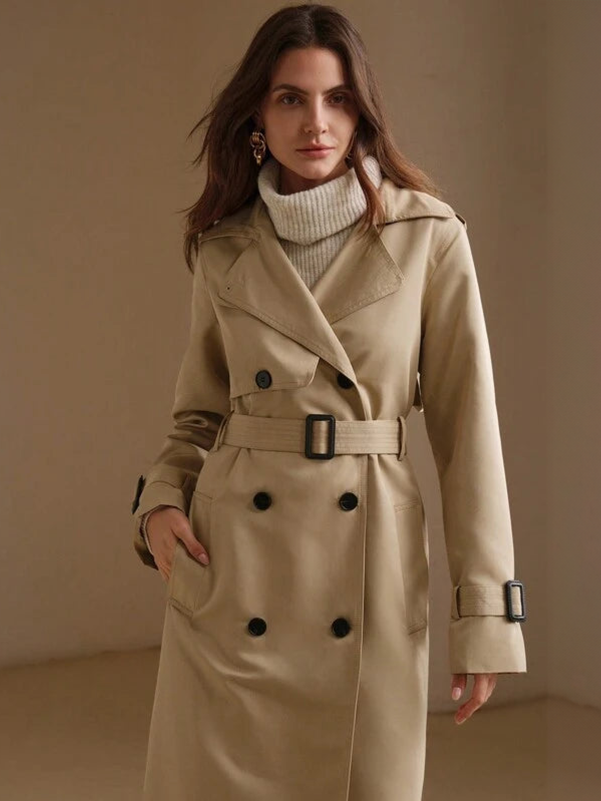 - Doppelreihiges Design & Gürtel – Betont die Taille für eine feminine Silhouette