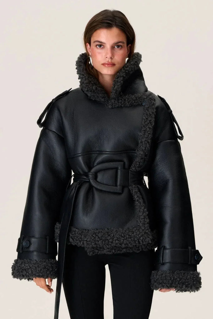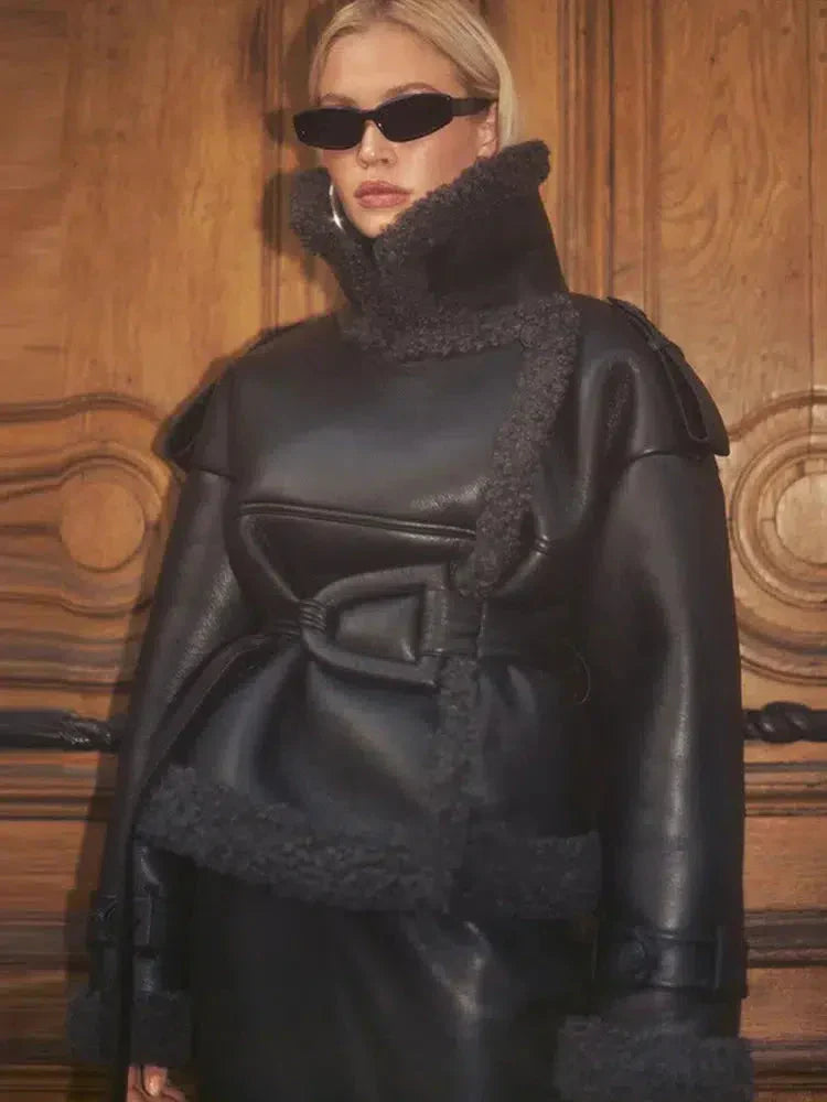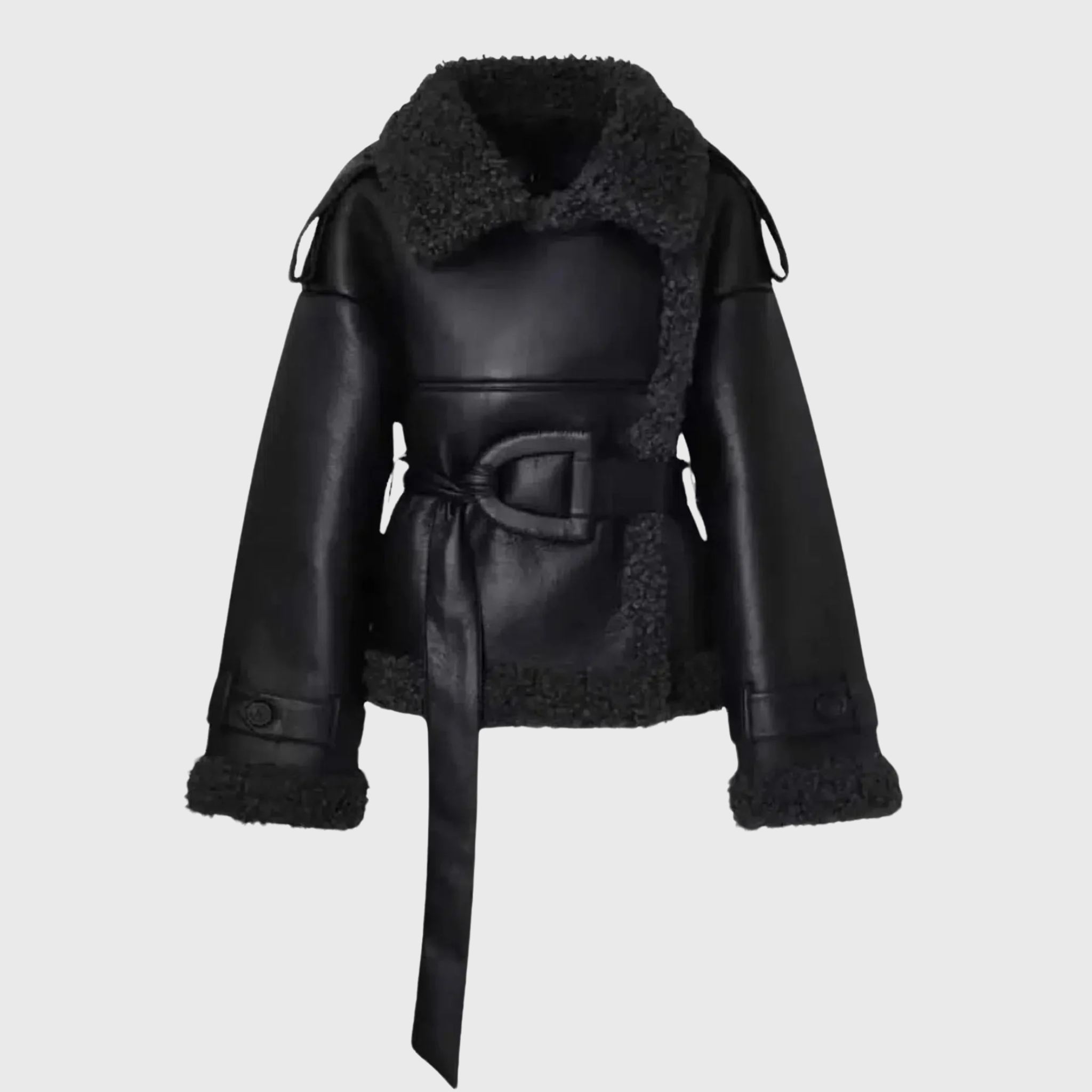 Corinne | Gefütterte Kunstlederjacke mit Taillengürtel